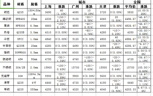 12月27日钢材重点产品价格汇总