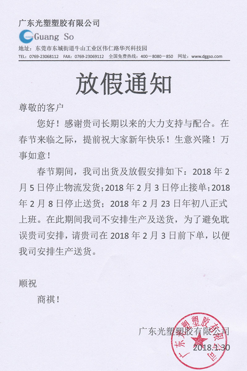 您好!以下是我司春节期间放假通知及安排。在春节来临之际,提前祝福大家现年快乐!生意兴隆!万事如意!