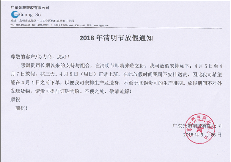 感谢贵司长期以来的支持与配合,在清明节即将来临之际,我司放假安排如下:4月5日至4月7日放假,共三天。4月8日(周日)正常上班。在此放假时间我司不安排送货,因此我司希望能在4月1日之前下单,以便我司安排生产及送货,不至于耽误贵司的生产排期。放假期间不对外发送货物,请贵司提前订购为盼。不便之处,敬请谅解!