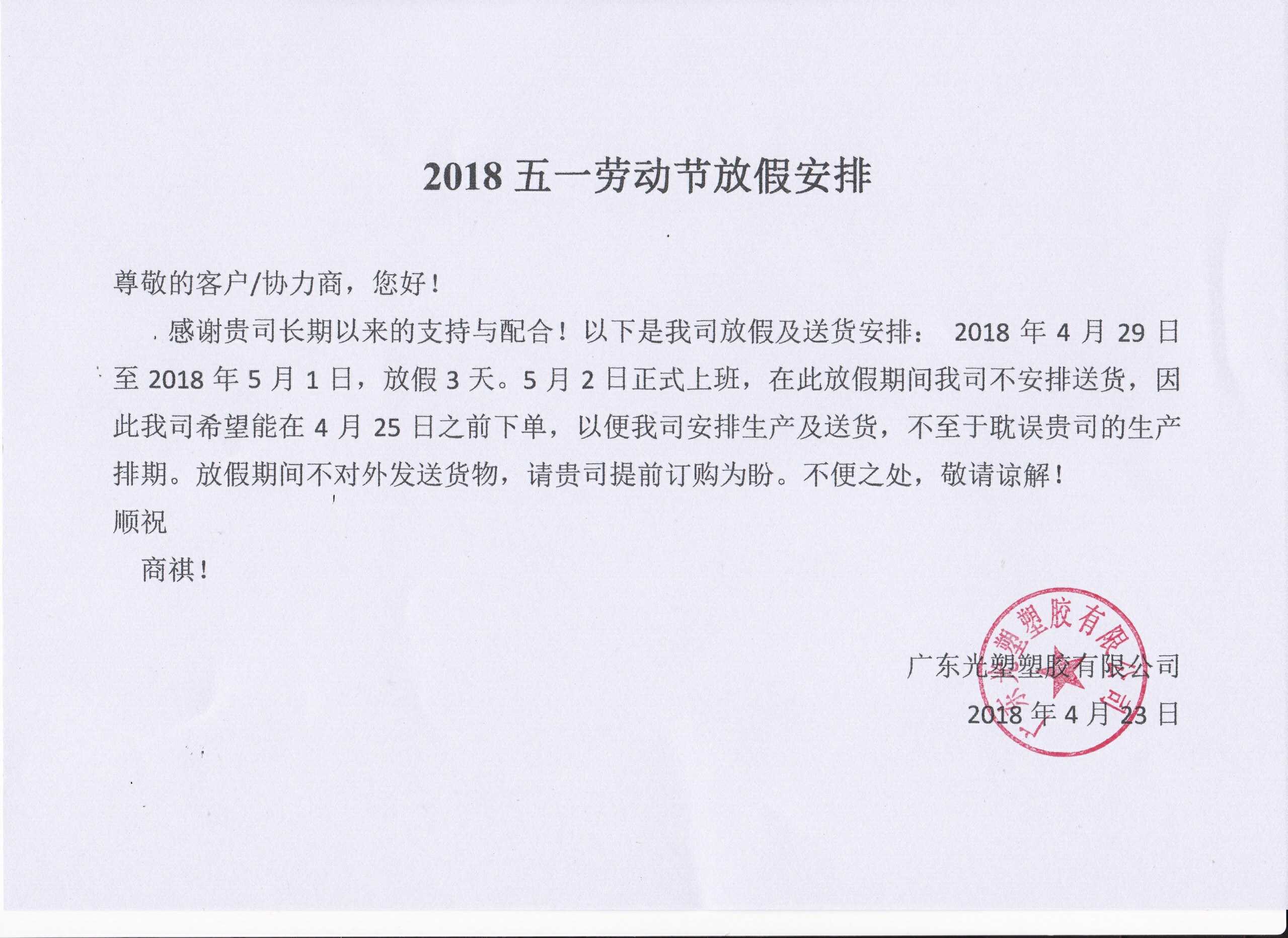 感谢贵司长期以来的支持与配合!以下是我司五一劳动节放假及送货安排:2018年4月29日至2018年5月1日,放假三天,5月2日正式上班。在此放假期间我司不安排送货,因此我司希望能在4月25日之前下单,以便我司安排生产及送货,不至于耽误贵司的生产排期。放假期间不对外发送货物,请贵司订购为盼,不便之处,敬请原谅!