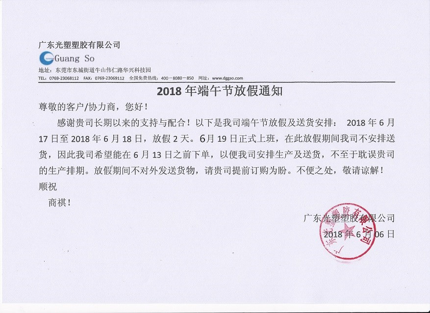 感谢贵司一直以来的支持与配合。以下是我司2018年端午节放假通知,望知悉!
