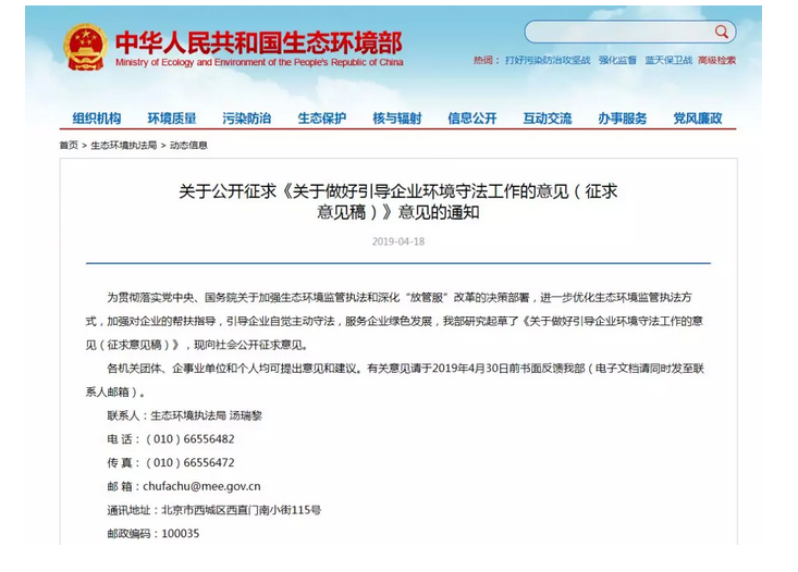 近日,生态环境部办公厅印发通知,向社会公开征求《关于做好引导企业环境守法工作的意见(征求意见稿)》意见。《意见》明确要求,建立单位内部“首接责任制”,对行政相对人实行有关事项“一次性告知”;对一般违法行为慎用查封、扣押等措施,严格禁止“一律顶格处罚”“一律关停”“先停再说”等简单粗暴行为。