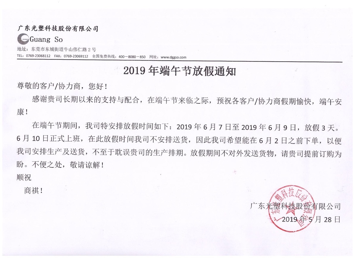 尊敬的客户/协力商,您好!感谢贵司长期以来的支持与配合!在端午节来临之际,预祝各位客户/协力商假期愉快,端午安康。在端午节放假期间,我司特安排放假时间如下:2019年6月7日至2019年6月9日放假,共三天,上班时间为2019年6月10日。因此我司特希望各客户能在6月2日前下单,以便我司安排生产及送货,不至于耽误贵司生产排期。放假期间不对外发送货物,请贵司订购为盼。不便之处,敬请谅解!