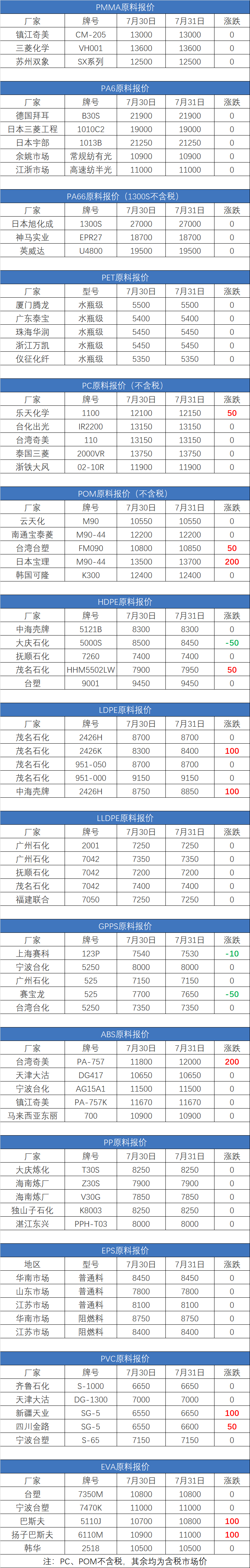 ABS:昨日国内ABS市场价格变动有限,部分型号缺货,价格局部小涨,终端需求进入淡季,成交维持刚需,市场成交不温不火;石化厂开工继续维持高负荷运行,供应量不减,但部分厂家交付前期订单,导致库存量小幅下降,目前场内暂无利好支撑,预计今日市场价格维持区间波动,华南地区宁波台化15A1主流市场价格参考在11500元/吨左右。(未含税)